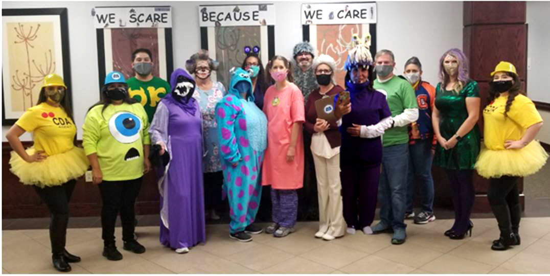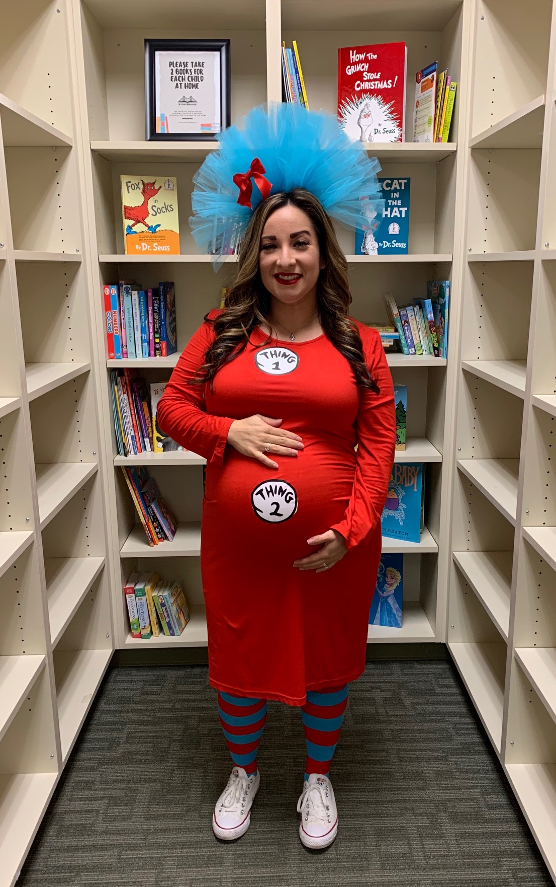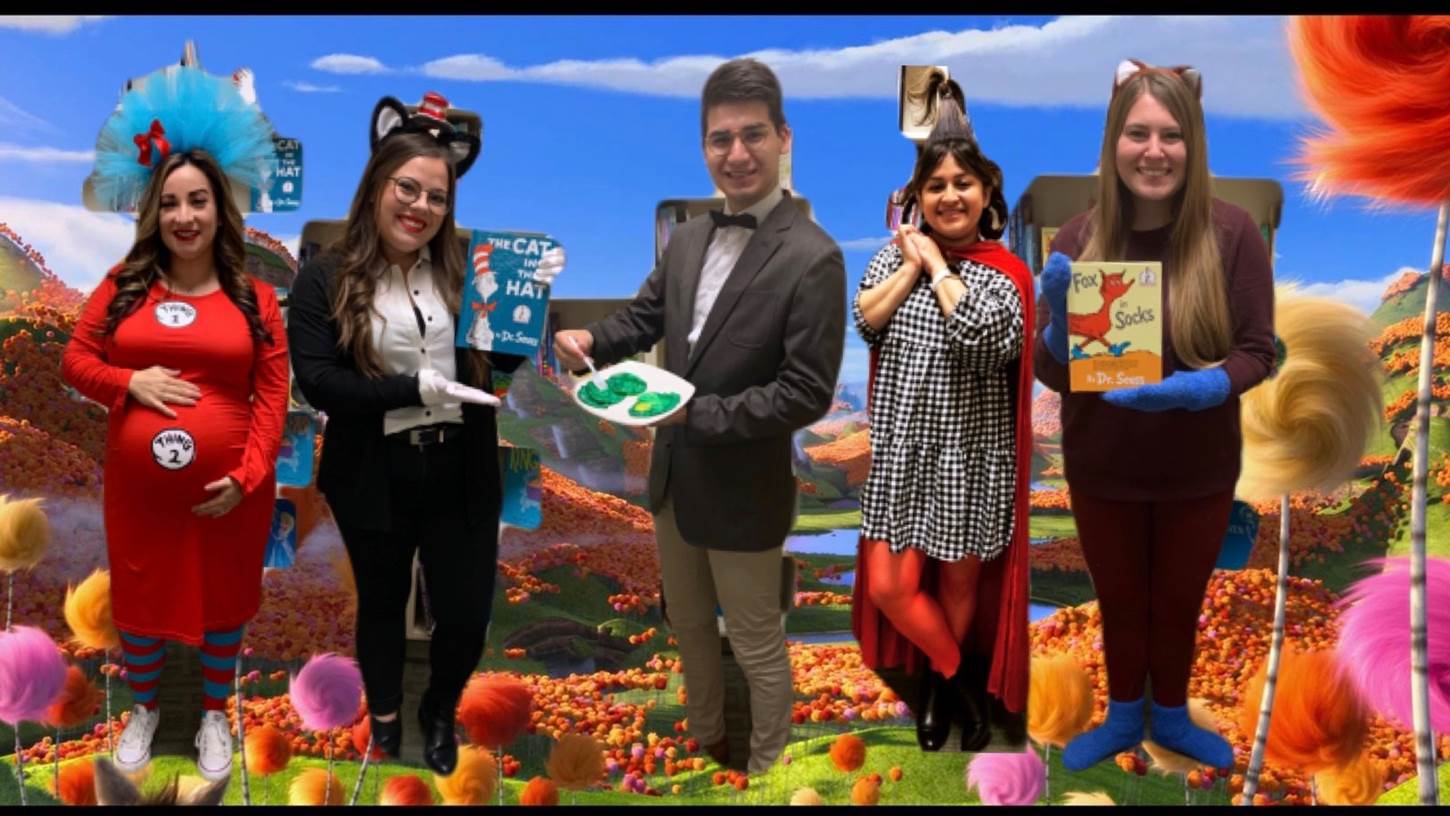 Thing 1 + 2, The Cat in the Hat, Dr. Seuss with green eggs and ham, Cindy Lou Who from The Grinch, and the Fox from Fox in Socks in The Lorax background